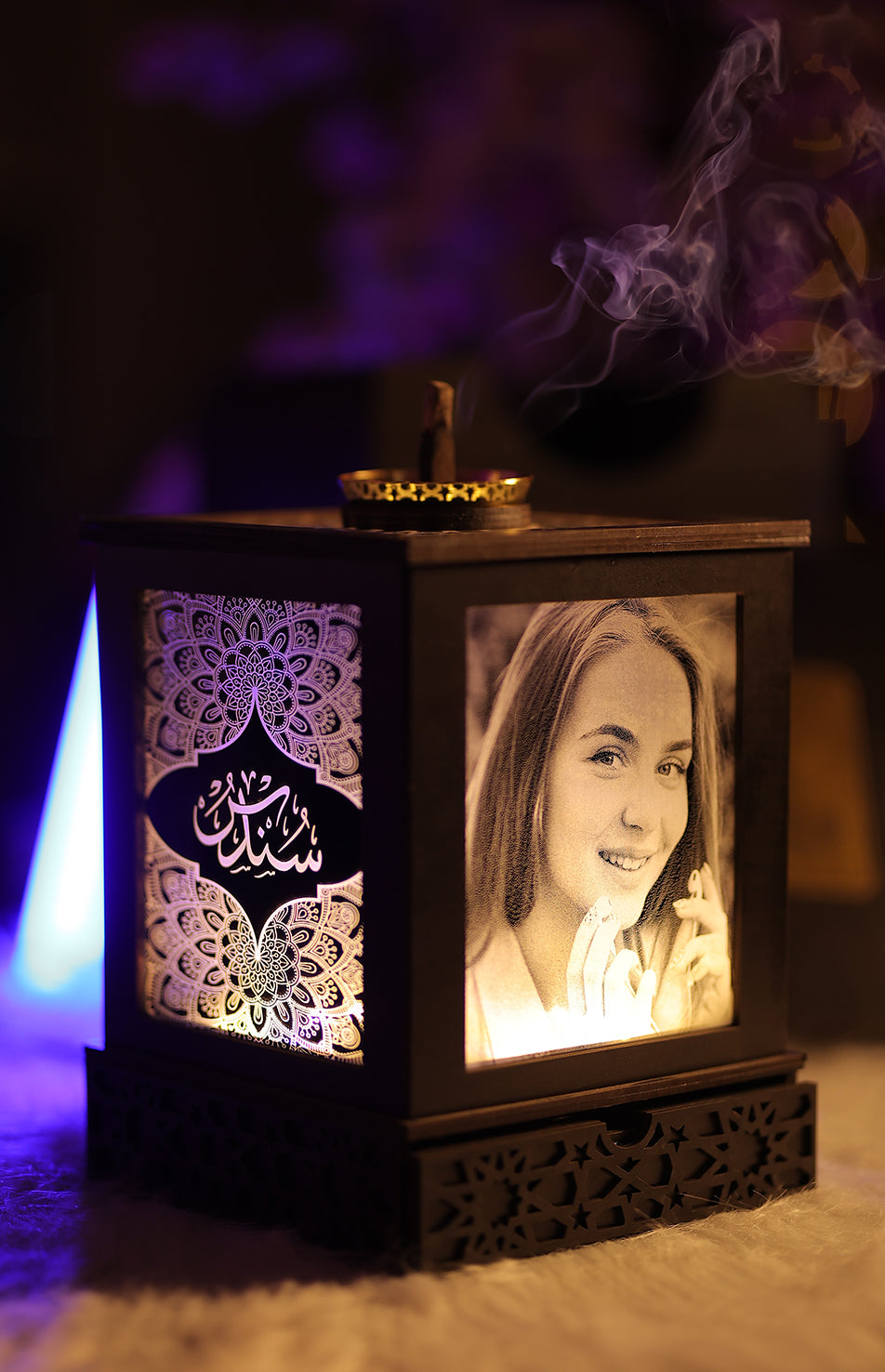 اختر اسمًا وعبارات ترحيبية لنقشها على جانبي المبخرة التي ستكون مضيئة ومزينة بزخارف جميلة.