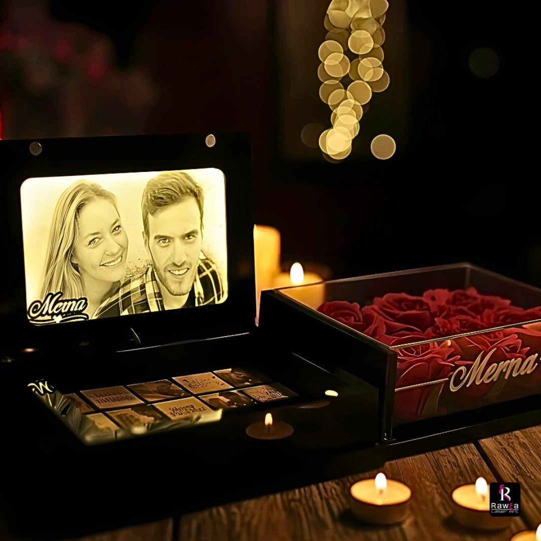 صورة مضيئة، وشوكولاتة أنيقة، وباقة ورد راقية - هدية مصممة لإثارة الإعجاب.