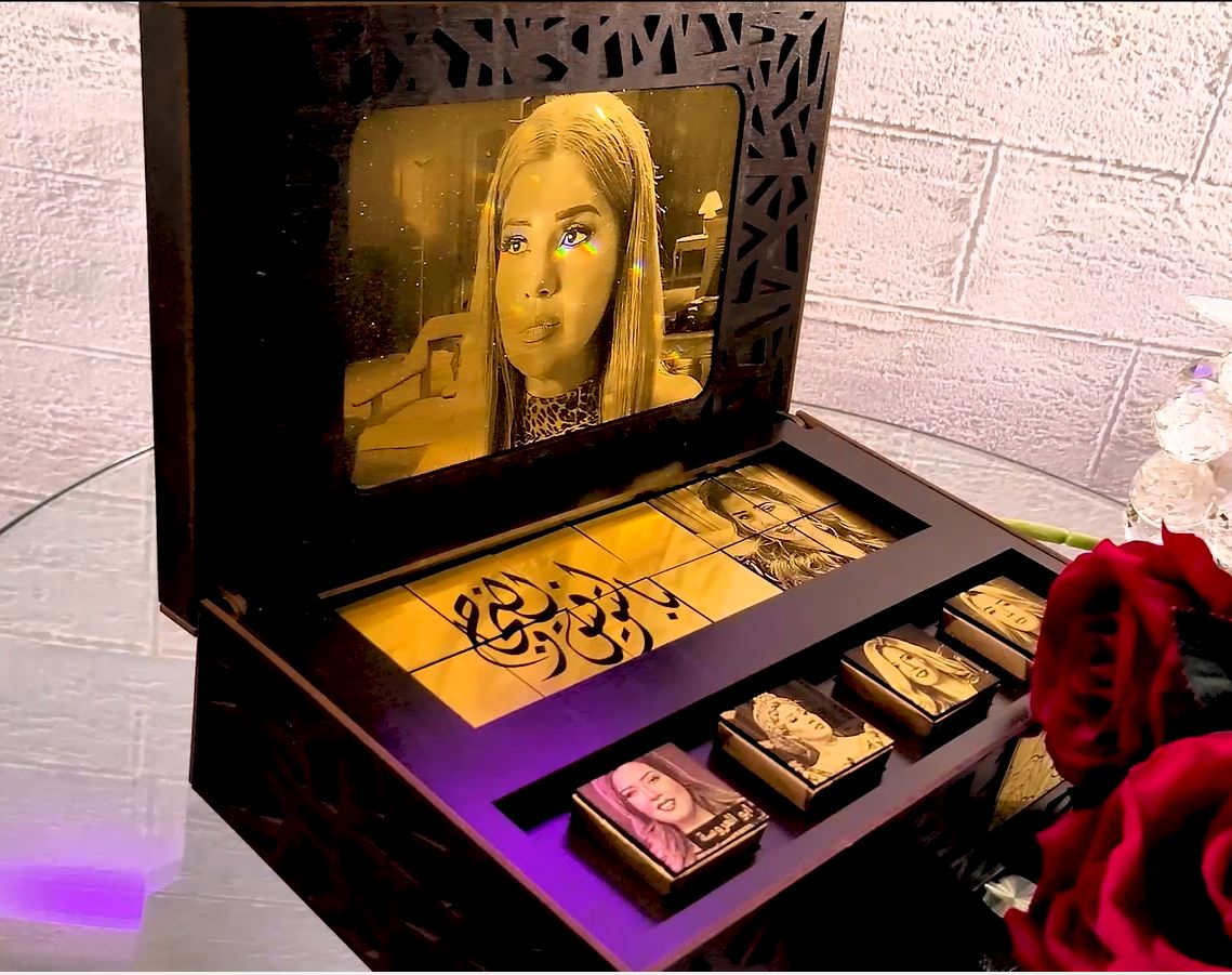 مخصصة مع صور من اختيارك محفورة على مادة ذهبية فاخرة على الصندوق وقطع الشوكولاتة لإنشاء هدية سحرية.